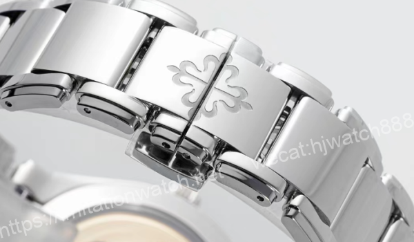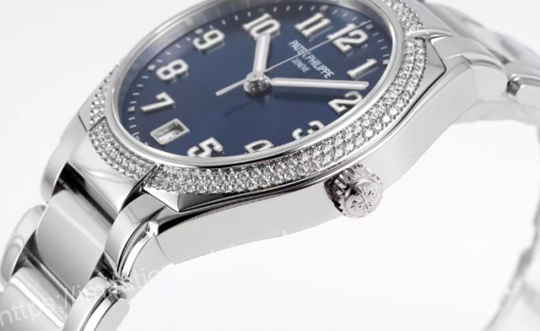 【錶殼】PP正品拆解開模,錶殼採用高噸位沖壓機冷模沖壓成型,再精心加工雕琢出輪廓。 承襲矩形系列腕錶的美學魅力,36MM的全新圓形錶殼,配備PP卡拉卓華專利折疊扣,脫戴方便。 錶鍊中心鏈節微微突起,與兩側的雙層鏈節融為一體,並和錶殼無縫結合。 在12時與6時的錶圈沿錶殼弧度彎曲並上升,精巧的鑲鑽錶圈結構,弧形藍寶石水晶表面,形成整個腕錶的桶形輪廓。