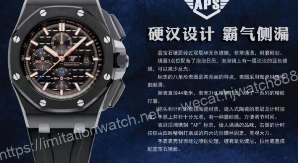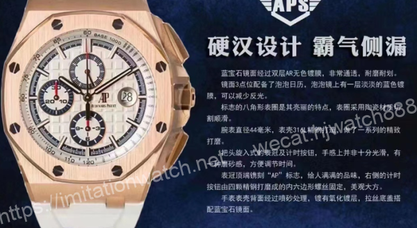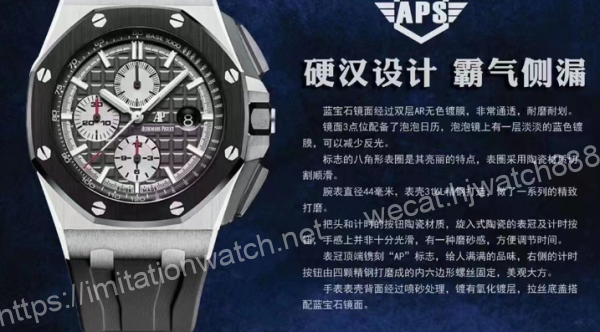 APS 愛彼26400 【錶鏡】錶鏡選用進口藍寶石玻璃鏡面,鍍防眩目後視鏡藍膜,通過太陽從每一個角度觀察,鏡面玻璃都十分具備藝術美。【圈口】圈口是與原裝一致的金屬拉絲紋理,圈口的六角螺絲跟錶框處在同一平面,沒有突顯或凹陷,能做到這一實際效果對模具精密度規定十分高!圈口激光切割十分整平,光澤度十足。【錶盤】錶盤以經典灰黑色格子圖案為背景色,一個個突顯的方格十分具備層次感,盤面字體樣式白平衡高,看不出來缺陷。三個小錶盤以白色的標尺突顯於灰黑色錶殼以上,在其中2個小錶盤的紅色表針尤其精彩紛呈醒目。十二點鐘方位的是小秒盤,三點鐘方位設立一個圓形日曆表窗口、多方面凹透鏡的裝飾,TPE變大實際效果與真品一致,而且含有表層的鍍膜,做到變大清除數據的實際效果;日曆表字體樣式同步正版。六點鐘方位和九點鐘方位的也是計時錶盤,全盤的全部時標正中間都用進口發光原材料填充,發光實際效果同原裝一致。表針頂部選用紅色裝點,別的二根表針的樣子十分整齊無毛刺。【冠】表冠採用六邊形陶瓷材質,頂端採用拉絲打磨技術,在復刻手錶冠左右分別是操縱計時的剛開始與中止和計時歸零的將頭,將頭十分突顯,看起來整表更為霸氣側漏。鈦金屬透底後蓋,打磨拋光的十分精美,中間是一塊藍寶石玻璃鏡面玻璃,與後蓋邊沿切合極致,十分耐磨損清楚。後蓋字體樣式為全新加工工藝手工雕刻而成,十分精美細緻;螺釘一樣跟後蓋在同一平面圖。【錶芯】錶芯在透底後蓋的襯托下更為霸氣側漏,灰黑色的全自動陀很有層次感,再加上錶芯表面的鑲嵌寶石。7750改3126十二位小秒機芯,與正版有一樣的穩定性驅動力。