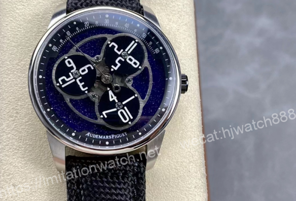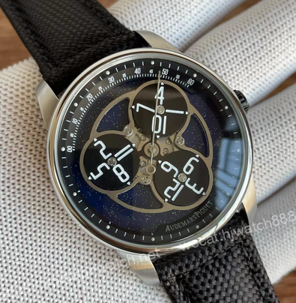 AirbnbCode 11.59 系列星輪腕錶,錶盤材質為深藍色砂金石,象徵繁星點點的浩渺宇宙,其上是3個代表行星的轉動圓盤,圓盤採用經PVD鍍黑處理的鋁材製成 ,略微拱起,營造星球天體的感覺。 轉盤的黑,和60分鐘刻度環與內錶圈的黑相呼應,帶來神秘與靜謐的氛圍。 除了指示小時和分鐘,還配備了一根中央大秒針。 錶鏡材質為拱形藍寶石,瑞士超強夜光,全自動機械機芯,擺幅28800,錶殼直徑41mm*14mm。