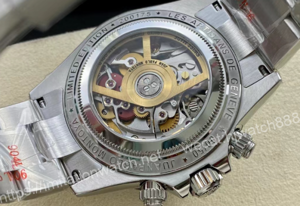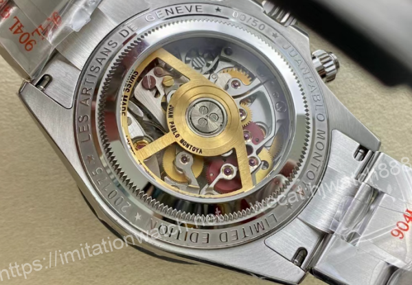 1:機芯採用丹東原4130機, 花重金復刻來自瑞士勞力士定製商Artisans de Genève團隊的縷空機芯,每個拆件都以非常高的精度逐一拆裝,進行縷空和手工製作切 角,讓縷空、主板,橋樑甚至主發條盒完全展開,大多數部件經過塗層、斜切以及拋光等精湛工藝,全縷空展現出來、賞心悅目!
