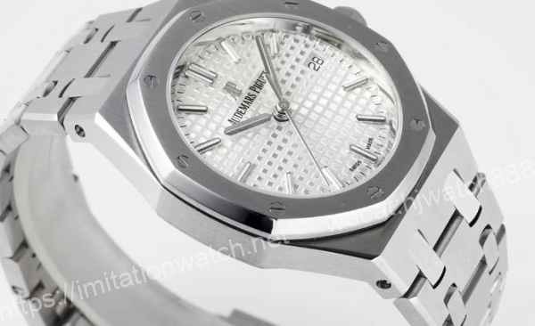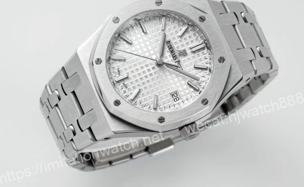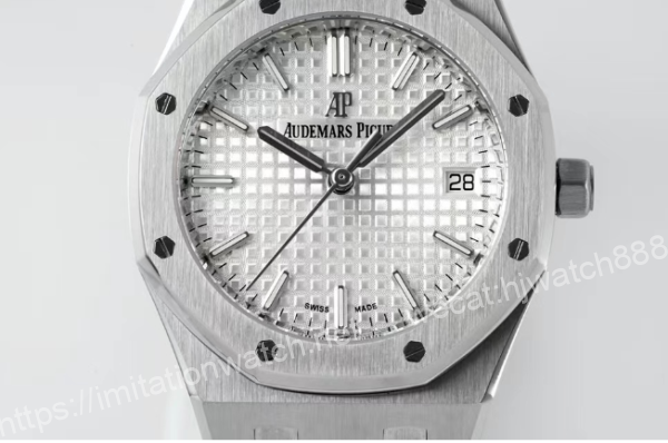 錶盤「Grande Tapisserie」大方格紋呈現凸起狀,搭配螢光立體時標和皇家橡樹指針,寬大的指針和時標讓讀時簡單清晰。 三點位置日期顯示窗口,以阿拉伯數字顯示。